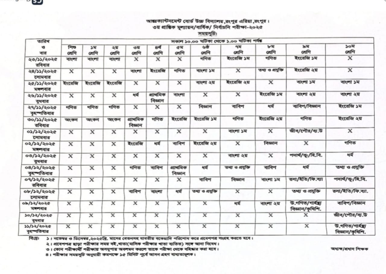 রুটিন: ৩য় প্রান্তিক মূল্যায়ন/বার্ষিক/নির্বাচনী পরীক্ষা -২০২৫ খ্রীঃ, বিস্তারিত…..